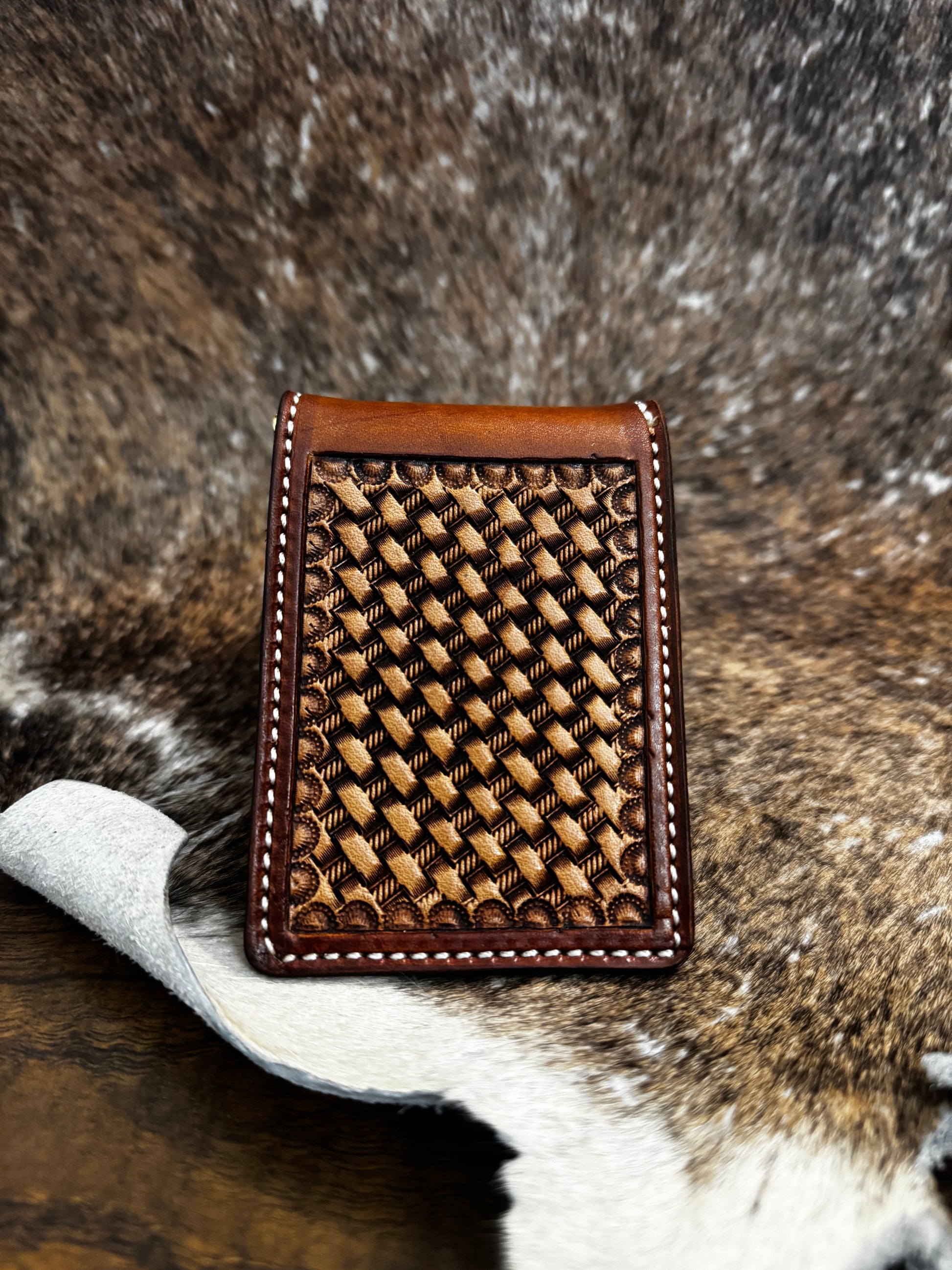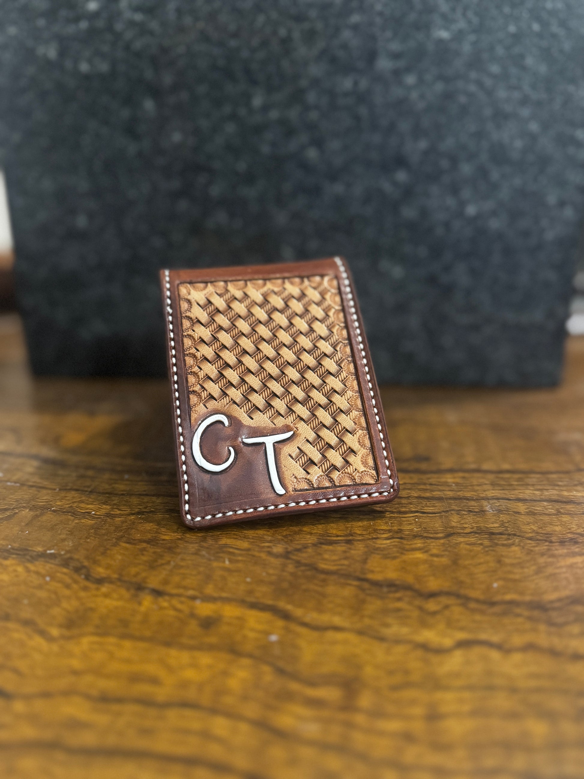 A custom tooled money clip wallet made of top tier veg-tan leather that you can customize however you'd like.